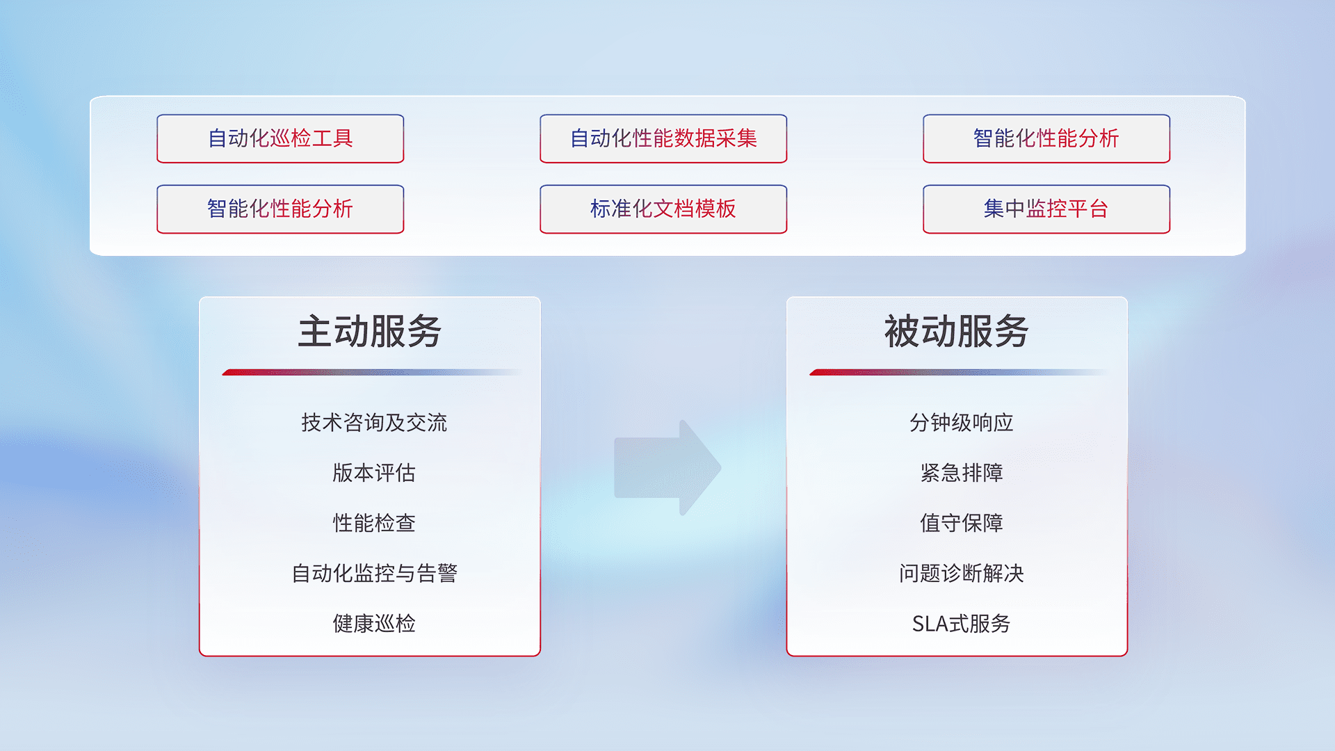 智能化工具和标准化文档,,,,保障服务质量,,,,提供主动服务(包含技术咨询、、版本评估、、性能检查、、、自动化监控与告警、、健康巡检)和被动服务包含(分钟级响应、、、紧急排障、、值守保障、、、问题诊断解决、、、、SLA服务)。。